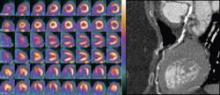 SPECT scan (left) and the corresponding computed tomography angiography image (right) of the left anterior descending coronary artery (curved multiplanar reformatted image). Note the luminal disease between two areas of dense calcification along the left anterior descending coronary artery. This was read as equivocal for obstructive coronary artery disease.