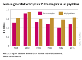 In 2015, pulmonologists generated $1.19 million in average net revenue for their affiliated hospitals, compared with $1.01 million in 2012, when Merritt Hawkins last conducted its survey of hospital chief financial officers.