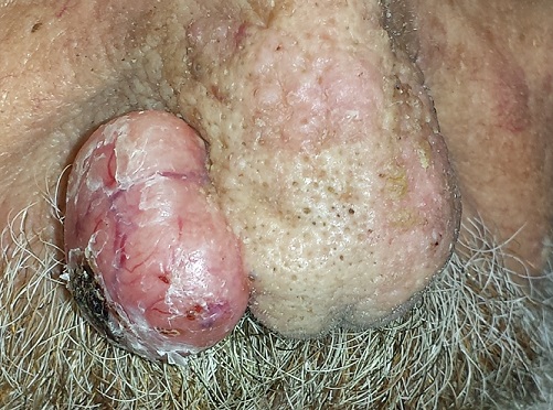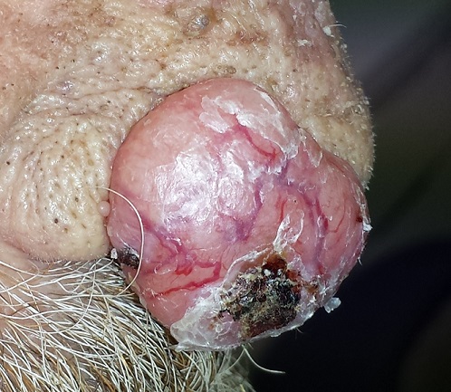An 80-year-old man is brought in by family for evaluation of a lesion on his nose. It manifested several years ago, at a smaller size, but has recently and abruptly grown. Although asymptomatic, the lesion is disturbing to the patient, who can now see it out of the corner of his eye.