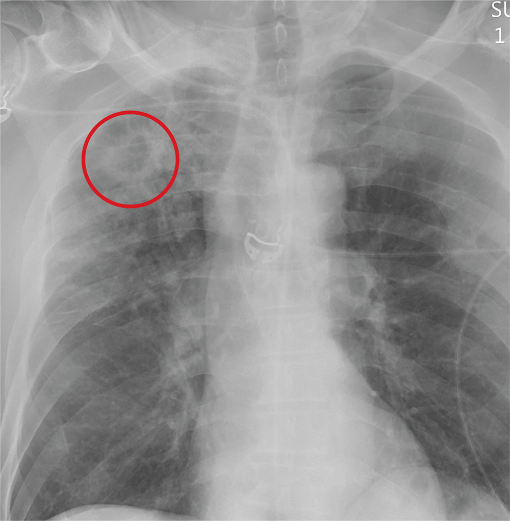 The radiograph demonstrates no acute fractures or pneumothorax. Of note is a right upper lobe infiltrate, which is a rounded cavitary lesion measuring approximately 4 cm. The differential includes pulmonary malignancy, active or previous pulmonary infection (eg, tuberculosis), or pneumatocele. Further evaluation with CT and a pulmonary consultation was coordinated.