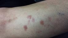 Several months ago, a 51-year-old woman first noticed brownish red lesions on her leg. She initially dismissed them as insect bites and regarded them as mostly a cosmetic concern. When the lesions failed to disappear after six months, her primary care provider referred the patient to dermatology. (In the interim, a friend did suggest ringworm as a diagnosis, but the OTC tolnaftate cream the patient tried had no effect.)