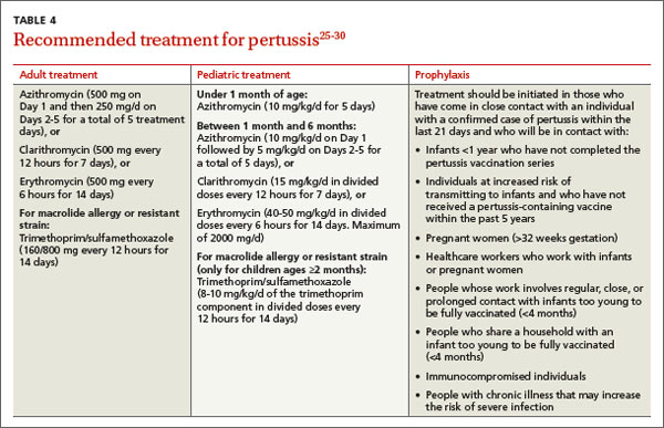 A macrolide antibiotic is generally used to treat pertussis (TABLE 4).25-30 Consider starting treatment before lab results are in when clinicial suspicion is high and the patient may be in contact with high-risk individuals. Erythromycin had been the drug of choice, but recent studies have found similar efficacy for azithromycin and clarithromycin.29 For infants younger than one month of age, azithromycin is preferred because in addition to being as effective as other macrolides, it has a better adverse effect profile.29 For patients who are at least 2 months of age, trimethoprim-sulfamethoxazole is an acceptable alternative to a macrolide.
