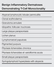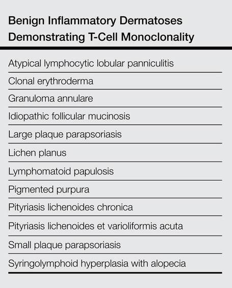 Jablonska et al5 were the first to coin the term mucinosis follicularis, now known as FM, to replace alopecia mucinosa because they felt the description was more accurate, as lesions also arise on non–hair-bearing skin. Although there is general agreement that there is a form of MF that has associated FM, this is where the agreement ends with regard to the diagnosis of MF versus FM. Böer et al6 discussed the historic evolution of these terms, mostly to highlight the origins of the confusion. The investigators proposed that FM should only be used as a descriptive term and that all cases of alopecia mucinosa represent MF. They also concluded that many benign dermatoses associated with a risk for evolution to MF (eg, small and large plaque psoriasis [LPP]) should simply be diagnosed as MF.6 Subsequently, the proposal that idiopathic FM and LAFM are not 2 distinct entities but rather a clinicopathologic continuum and that idiopathic FM is simply a variant of MF along this spectrum has gained some approval.6,7 However, this belief is not shared among all authorities in the field, and attempts to define diagnostic criteria that distinguish between a benign clinical course and a course that is more progressive and fatal continue. Currently, it is agreed upon that when distinguishing between these 2 clinical courses, primary (idiopathic) follicular mucinosis refers to a benign course with no overt sign of malignancy, and lymphoma-associated follicular mucinosis refers to a diagnostic malignant condition. Lymphoma-associated follicular mucinosis refers to FM associated with cutaneous T-cell lymphoma, the most common form of which is FM. Many authors8-15 have sought ancillary methodologies in addition to clinical parameters to assist in the evaluation between both disease courses. Methodologies have included assessment of T-cell receptor gene rearrangements, flow cytometry, and immunohistochemical staining, mostly as an effort to establish monoclonality as a defining characteristic of LAFM; however, monoclonality in cutaneous T-cell infiltrates should be interpreted with caution and should not be considered as a confirmation of malignancy due to recent findings of monoclonality in benign inflammatory dermatoses such as lichen planus. The Table outlines several of the most common benign inflammatory dermatoses that demonstrate monoclonality, but this list should not be considered exhaustive, as there are many others in which monoclonality is sometimes seen.8-15 The lack of definitive criteria to distinguish between the 2 groups has led to confusion and consternation regarding the diagnosis of idiopathic FM versus LAFM and has led many in the field to consider the 2 conditions to be one and the same.