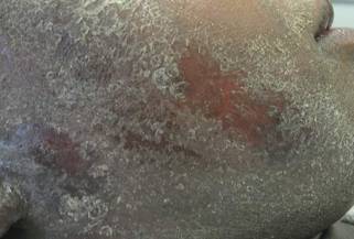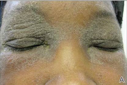 A 21-year-old gravida 3, para 2, aborta 0pregnant woman (29 weeks’ gestation) with a history of chronic AD who was hospitalized with facial edema, purulent ocular discharge, and substantial worsening of AD presented for a dermatology consultation. Her AD was previously managed with topical steroids but had been complicated by multiple methicillin-resistant Staphylococcus aureus (MRSA) infections. On physical examination, she had substantial periorbital edema with purulent discharge from both eyes (Figure 1A), perioral crust with radial fissures (Figure 2A), and mild generalized facial swelling and desquamation (Figure 3). However, the oral cavity was not involved. She had diffuse desquamation in addition to chronic lichenified plaques of the arms, legs, and trunk and SSSS was clinically diagnosed. Cultures of conjunctival discharge were positive for MRSA. The patient was treated with intravenous vancomycin and had a full recovery (Figures 1B and 2B). She delivered a healthy newborn with Apgar scores of 9 and 9 at 1 and 5 minutes, respectively, at 36 weeks and 6 days’ gestation by cesarean delivery; however, her postoperative care was complicated by preeclampsia, which was treated with magnesium sulfate. The newborn showed no evidence of infection or blistering at birth or during the hospital stay.