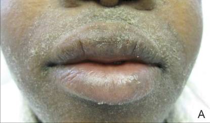 Figure 1. Periorbital edema with purulent ocular discharge before (A) and after (B) treatment. | Figure 2. Perioral desquamation and radial fissuring before (A) and after (B) treatment. |