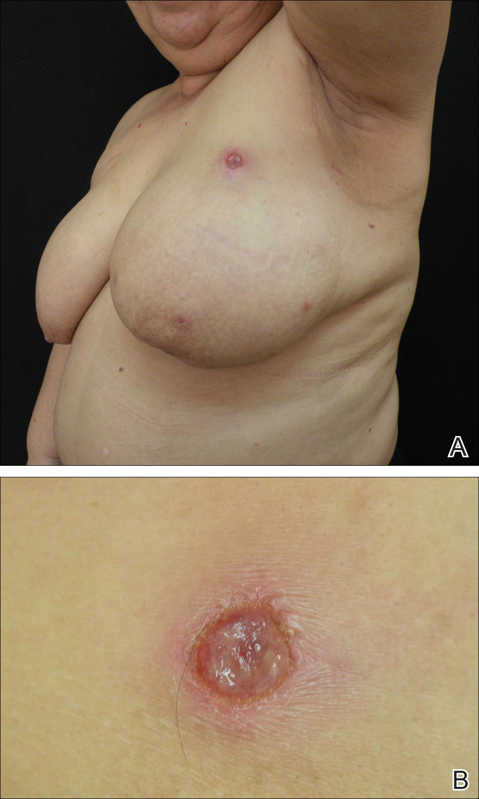 A 59-year-old woman presented with new-onset cutaneous lesions on the left breast. The patient had a history of invasive ductal carcinoma of the left breast, which had been treated 5 years prior with a partial mastectomy and radiotherapy (10 Gy per week for 5 consecutive weeks [50 Gy total]). Physical examination revealed a large nodular lesion with a necrotic surface on the upper half of the left breast as well as 3 small papular lesions with eroded surfaces on the lower half of the breast (Figure 1). A clinical diagnosis of cutaneous metastases from breast carcinoma was suspected.