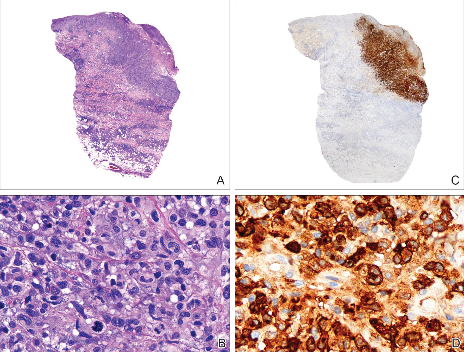 Biopsies from one small papule and the large nodular lesion showed similar findings consisting of a necrotic epidermis covered by crusts and a wedge-shaped infiltrate involving the superficial dermis (Figure 2A). The infiltrate was mostly composed of large atypical mononuclear cells with oval to kidney-shaped nuclei, prominent nucleoli, and ample basophilic cytoplasm. Many mitotic figures were seen within the infiltrate (Figure 2B). The infiltrate of atypical cells was admixed with small lymphocytes, histiocytes, and some eosinophils. Immunohistochemically, the large atypical cells expressed CD2, CD3, CD4, CD45, CD30, and epithelial membrane antigen (Figures 2C and 2D). A few atypical cells also expressed CD8 and T-cell intracellular antigen 1. Approximately 60% of the nuclei of the atypical cells showed MIB-1 positivity, while CD20, CD56, AE1/AE3, S-100 protein, CD34, and CD31 were negative. The anaplastic lymphoma kinase was not expressed in atypical cells. Monoclonal rearrangement of the γ T-cell receptor was demonstrated on polymerase chain reaction. Physical examination showed no lymphadenopathy in any lymph node chains. Computed tomography of the chest and abdomen failed to demonstrate systemic involvement. On the basis of these clinical, histologic, immunohistochemical, and molecular results, a diagnosis of type A regional LyP was established.