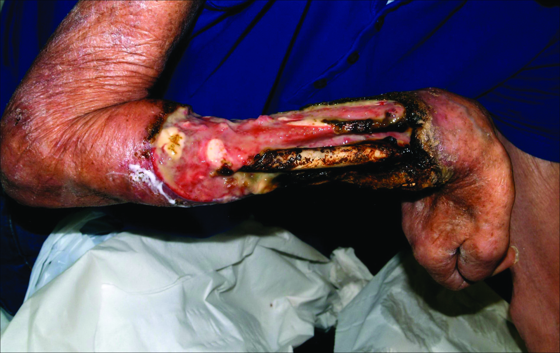 A 63-year-old builder was referred by his general practitioner with a chronic wound on the right forearm of 4 years’ duration. His medical history included psoriasis, and he did not have a history of diabetes mellitus or use of immunosuppressants. The general practitioner suggested possible incidental origin following a prior trauma or a psoriatic-related lesion. The patient reported that the lesion did not resemble prior psoriatic lesions and it had deteriorated substantially over the last 2 years. Furthermore, a small ulcer was starting to develop on the left forearm. Further advice was requested by the general practitioner regarding wound dressings. On examination a sloughy ulcer measuring 8.5×7.5 cm had eroded to expose necrotic tendons with surrounding induration and cellulitis (Figure 1A). In addition, a psoriatic lesion was found on the left forearm (Figure 1B). There were no palpable axillary lymph nodes. Clinical suspicion, incision biopsies, and subsequent histology confirmed cutaneous CD4+ T-cell lymphoma. This case was reviewed at a multidisciplinary team meeting and referred to the hematology-oncology department. The patient subsequently underwent chemotherapy with liposomal doxorubicin and radiotherapy over a period of 5 months. An elective right forearm amputation was planned due to erosion of the ulcer through tendons down to bone (Figure 2).