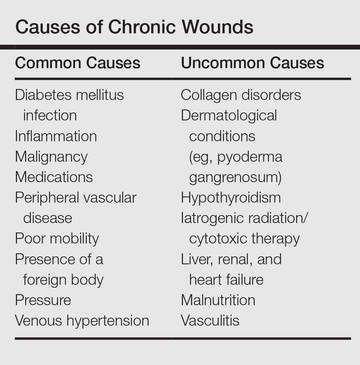 These 2 cases highlight easy pitfalls for an unsuspecting clinician. Although both cases had alternative plausible explanations, they proved to be cutaneous malignancies. The powerful message these cases send is that long-standing chronic wounds should be biopsied to exclude malignancy. Some of the other common underlying causes of wounds that may prevent healing are highlighted in the Table. Vascular insufficiency usually presents in characteristic patterns with a good clinical history and associated signs and findings on investigation. A foreign body, which can be anything from an orthopedic metal implant to a retained stitch from surgery or nonmedical material, may be the culprit and may be identified from a thorough medical history or appropriate imaging.