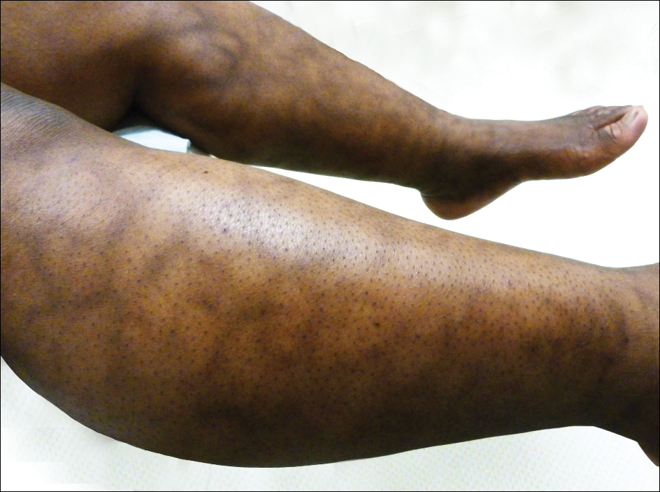 Livedo vasculopathy was excluded in our patient due to the lack of diagnostic histopathologic findings, such as fibrin deposition and thrombus formation involving the upper- and mid-dermal capillaries. 9 Furthermore, characteristic direct immunofluorescence findings of a homogenous or granular deposition in the vessel wall consisting of immune complexes, complement, and fibrin were absent in our patient. 9 Our patient also lacked common clinical findings found in livedo vasculopathy such as small ulcerations or atrophic, porcelain-white scars on the lower legs. Erythema ab igne also was excluded in our patient due to the absence of heat exposure and presence of fibrin occlusion in the superficial leg veins. Physiologic livedo reticularis, defined as a livedoid pattern due to physiologic changes in the skin in response to cold exposure, 10 also was excluded, as our patient's cutaneous changes included an alteration in pigmentation with a brown reticular pattern and no blanching, erythematous or violaceous hue, warmth, or tenderness.