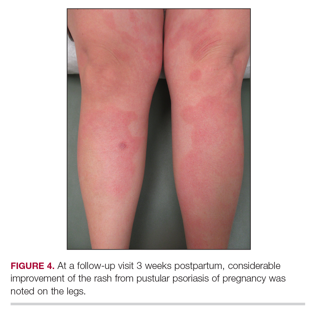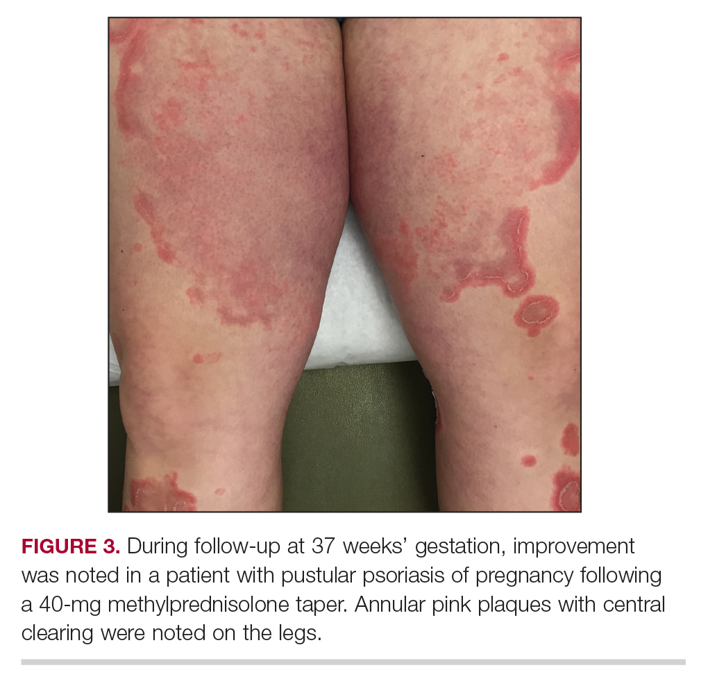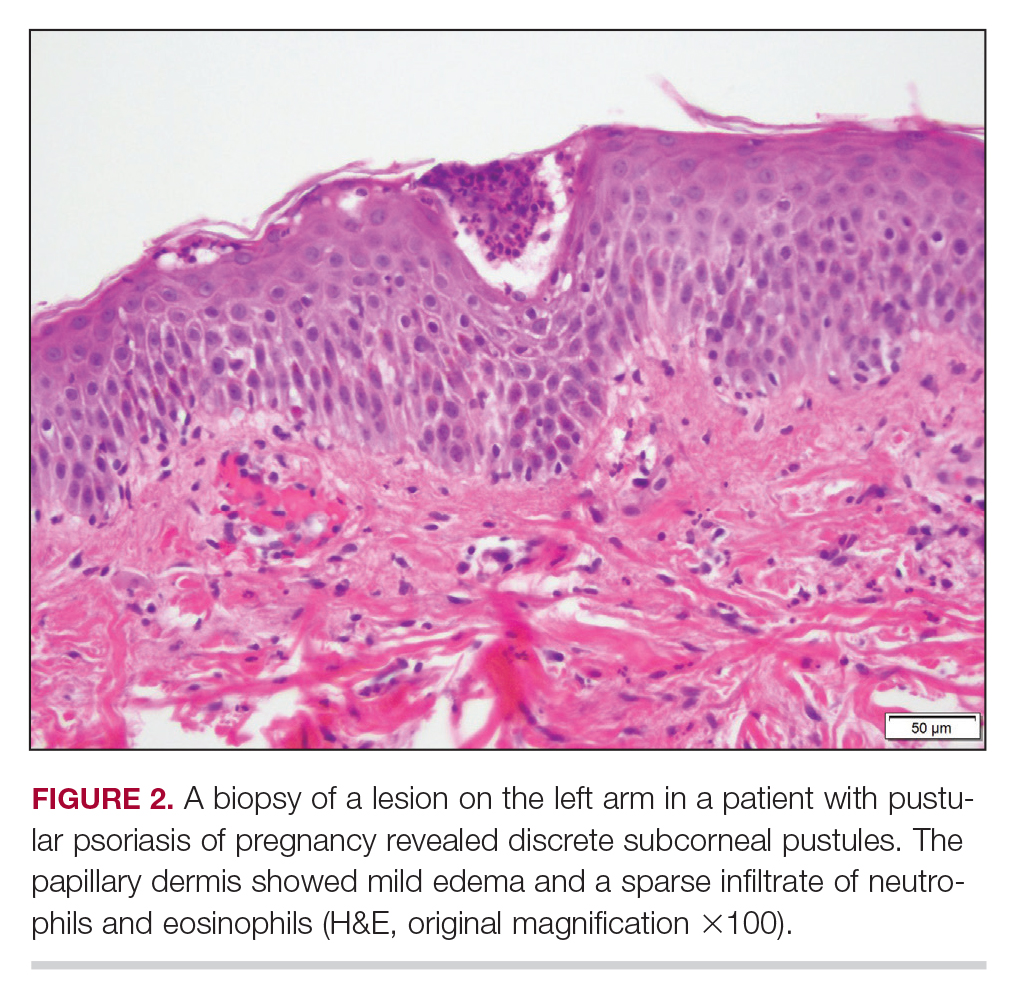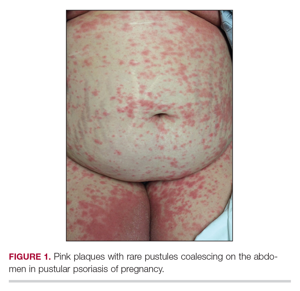 Pustular psoriasis of pregnancy (PPP) is a rare but potentially serious dermatosis of pregnancy. Left untreated, PPP can be fatal for both the mother and the fetus.1,2 Contrary to many other pregnancy dermatoses, which are typically limited to the skin, systemic signs and symptoms often accompany PPP, including fatigue, fever, diarrhea, delirium, elevated markers of inflammation such as an increased erythrocyte sedimentation rate, and increased white blood cell counts.1,3,4 Progression of the rash to erythroderma with subsequent dangerous fluid and electrolyte imbalances, loss of thermoregulation in the skin, and the risk for secondary infection and sepsis can occur in severe cases.1,5