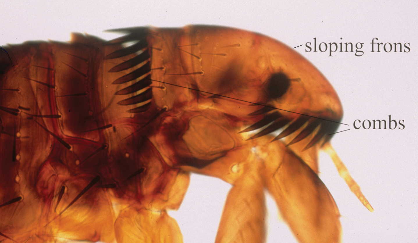 Ctenocephalides fleas, including the common cat flea and the dog flea, have a characteristic pronotal comb that resembles a mane of hair (Figure 1) and genal comb that resembles a mustache. Compared to the dog flea (Ctenocephalides canis), cat fleas have a flatter head and fewer hair-bearing notches on the dorsal hind tibia (the dog flea has 8 notches and the cat flea has 6 notches)(Figure 2).