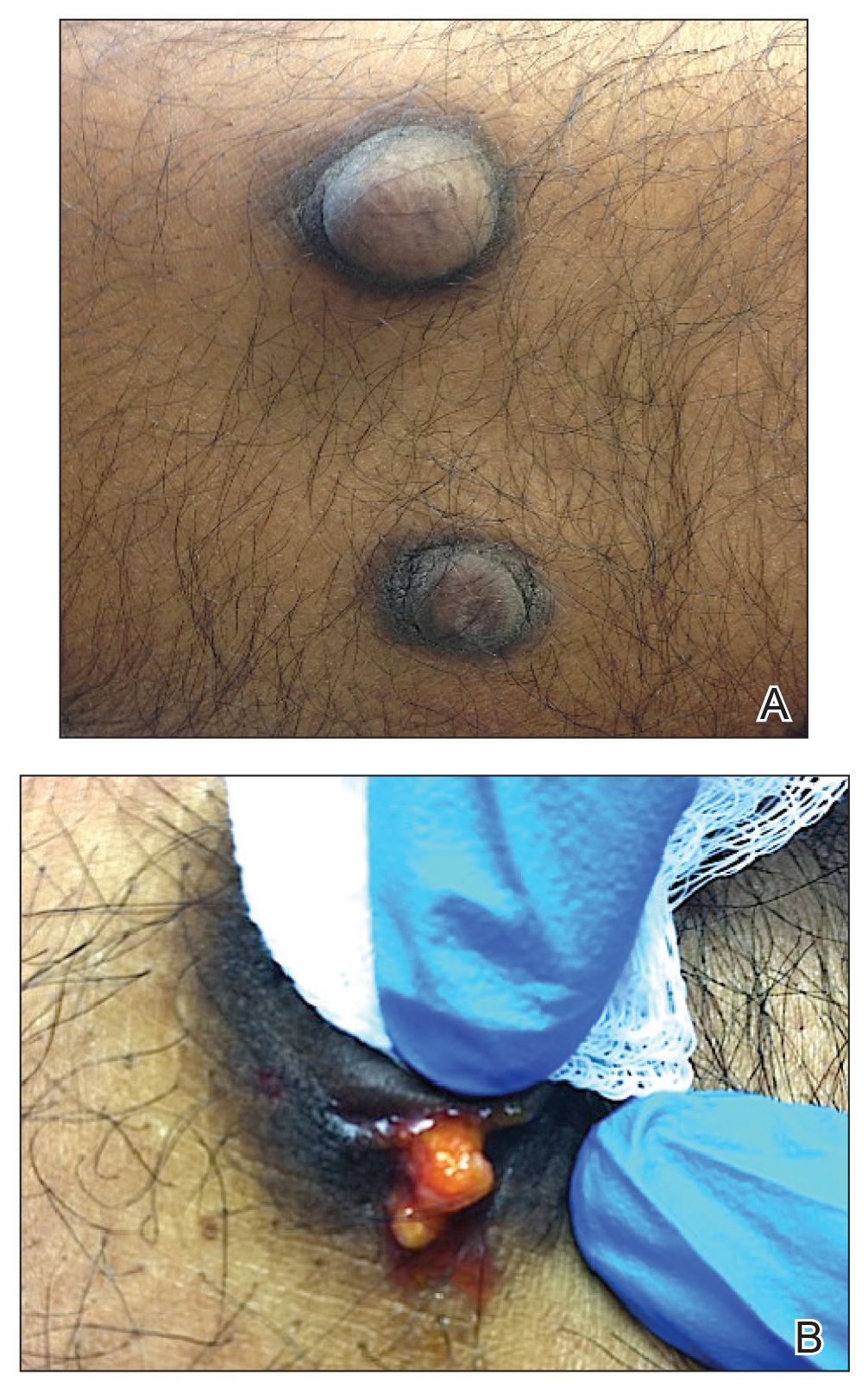 On physical examination, 2 soft, nontender, exophytic nodules were noted on each upper thigh with surrounding hyperpigmented and hyperkeratotic collarettes (Figure 1). The nodules ranged in size from 2 to 3.5 cm in diameter.