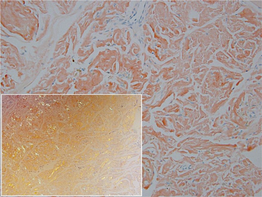 Remarkable laboratory data included a fasting glucose level of 207 mg/dL (reference range, 70–110 mg/dL) and a glycohemoglobin of 8.8% (reference range, <5.7%). Serum protein electrophoresis and immunofixation were normal. Histopathology of the lesions demonstrated diffuse deposition of pink amorphous material associated with prominent papillomatosis, hyperkeratosis, and acanthosis (Figure 2). Congo red staining was positive with green birefringence under polarized light, indicative of amyloid deposits (Figure 3). Liquid chromatography–tandem mass spectrometry of the specimens was consistent with deposition of AIns amyloidosis.