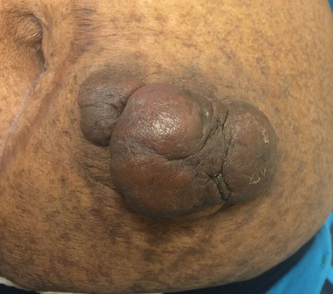 On physical examination, 2 hyperpigmented, exophytic, smooth nodules were noted on the right and left lower abdomen, ranging in size from 2.5 to 5.5 cm in diameter (Figure 4).