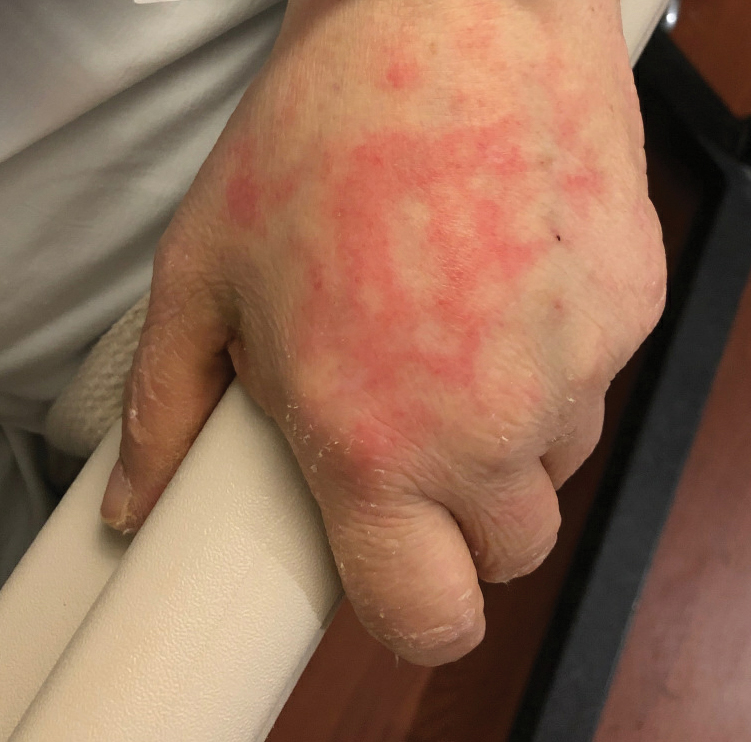 Urticarial lesions represent approximately 7% to 19% of reported COVID-19–associated rashes.9,13,14 Urticarial rashes in patients testing positive for SARS-CoV-2 primarily occur on the trunk.14 The urticaria, which typically last about 1 week,14 are seen most frequently in middle-aged patients (mean/median age, 42–48 years)13,14 and are associated with pruritus, which has been reported in 74% to 92% of patients.13,14 Urticarial lesions typically do not precede other symptoms of COVID-19 and are nonspecific, making them less useful diagnostically.14