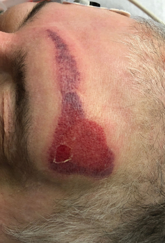 Netlike purpuric or violaceous patches signifying vessel damage or occlusion have been seen in association with COVID-19, constituting approximately 6% of COVID-19–associated skin findings in 2 studies.13,14 Livedoid rash (Figure 2) and retiform purpura (Figure 3) are associated with older age and occur primarily in severely ill patients, including those requiring intensive care. In a registry of 716 patients with COVID-19, 100% of patients with retiform purpura were hospitalized, and 82% had acute respiratory distress syndrome.13 In another study, 33% (7/21) of patients with livedoid and necrotic lesions required intensive care, and 10% (2/21) died.14