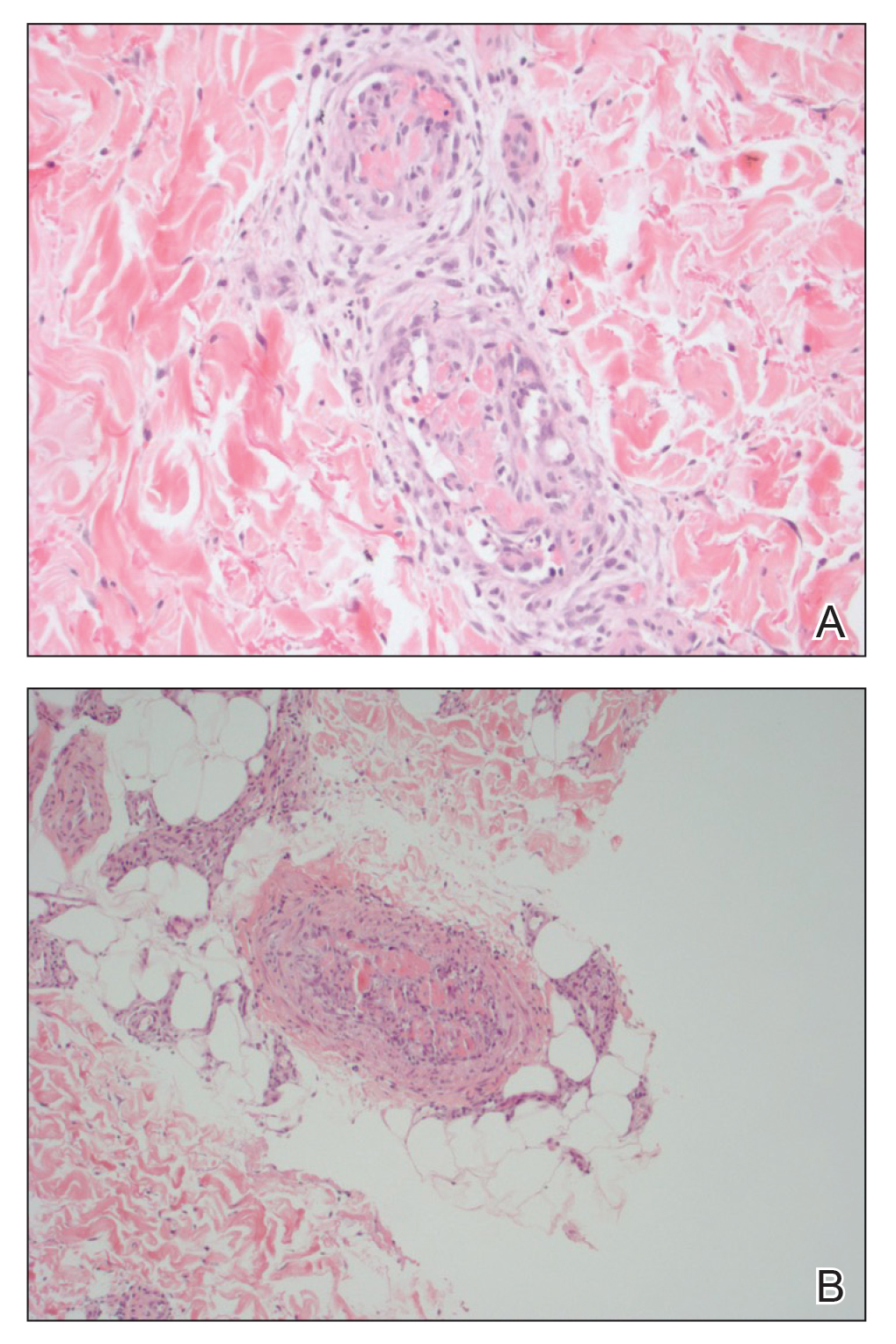 Coagulation studies and white blood cell counts were within reference range. A urine toxicology screen was positive for cocaine; however, urine testing for levamisole was not performed given the short half-life of levamisole in vivo. A biopsy of one of the skin lesions on the right thigh showed pauci-inflammatory superficial and deep vein thrombosis with recanalization (Figure 2). A rheumatology workup revealed an elevated C-reactive protein level, low C3, positive antinuclear antibody, positive anti–double-stranded DNA, positive anticardiolipin antibody, positive lupus anticoagulant, and positive perinuclear antineutrophil cytoplasmic antibody (ANCA). Tests for HIV, hepatitis B and C, cryoglobulinemia, and cytomegalovirus were negative. Given the clinical picture and laboratory findings, levamisole-induced vasculitis was deemed likely. The patient was treated with appropriate skin and wound care. She was discharged with a prednisone taper and oral cephalexin and was counseled on cocaine cessation.