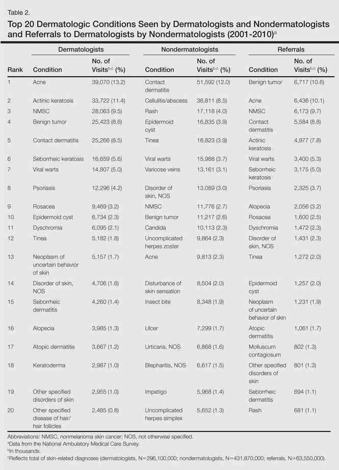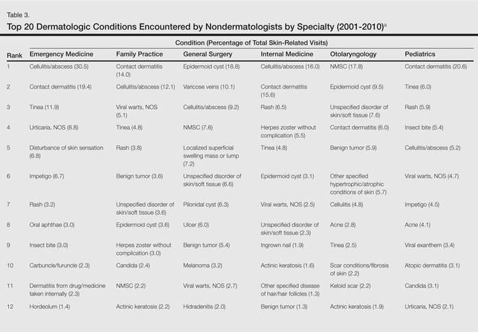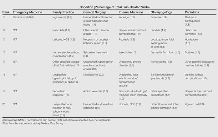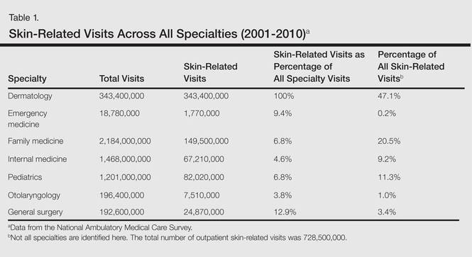 From 2001 to 2010, more than 700 million outpatient visits for skin-related problems were identified, with 676.3 million visits to dermatologists, emergency medicine physicians, family practitioners, general surgeons, internists, otolaryngologists, and pediatricians. More than half (52.9%) of all skin-related visits were addressed by nondermatologists during this time. Among nondermatologists, family practitioners encountered the greatest number of skin diseases (20.5%), followed by pediatricians (11.3%), internists (9.2%), general surgeons (3.4%), otolaryngologists (1.0%), and emergency medicine physicians (0.2%)(Table 1).