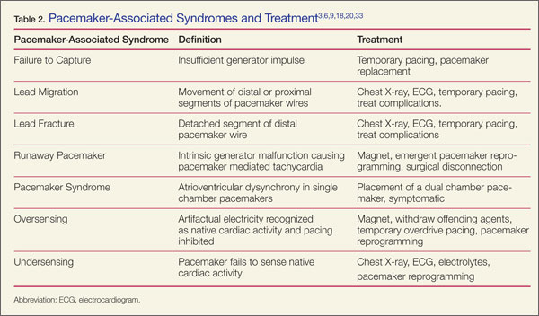 When ischemia is no longer a concern, address the device itself. Workup involves history and physical examination, with complete blood count, chest X-ray, cardiac biomarkers, basic metabolic panel, ultrasound, and device interrogation, as indicated. Table 2 provides a summary of associated pacemaker syndromes and treatment.