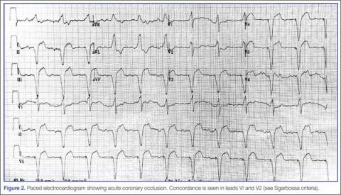 - ST elevation ≥5 mm in a lead with downward (discordant) QRS complex; 2 points.13,15