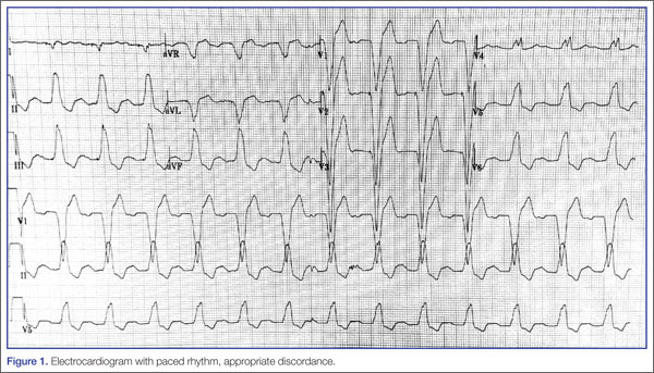 Because of the underlying rhythm induced by the cardiac pacemaker stimulation, acute coronary occlusion can be subtle.12 Since the pacemaker depolarizes the right ventricle, the delay in left ventricular depolarization is seen as left bundle branch block (LBBB) on electrocardiogram (ECG).13,14Figure 1 shows an ECG demonstrating paced rhythm and appropriate discordance, while the ECG in Figure 2 demonstrates acute coronary occlusion. Therefore, identification of coronary occlusion in the paced patient is done using the following Sgarbossa criteria:
