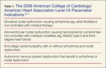 The pacemaker consists of a generator and its leads. The generator produces an electrical impulse that travels down the leads to depolarize myocardial tissue.4 A pacemaker corrects abnormal heart rhythms, using these electrical pulses to induce a novel sinus rhythm.5,6Table 1 summarizes the 2008 American College of Cardiology/American Heart Association Level I/II indications for pacemaker placement.