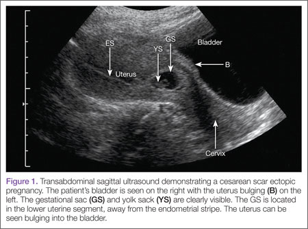 Regardless of one’s clinical suspicion, the diagnosis is made (or ruled out) through ultrasound. Uterine scar ectopic pregnancy is suspected when ballooning of the lower uterine segment is noted,1 when a trophoblast is seen at a presumed cesarean scar beneath the utero-vesicular fold, and when myometrium between the gestational sac and bladder wall is thin (<8 mm).2 As seen with this patient, the diagnosis is challenging as a uterine scar ectopic pregnancy can easily be mistaken for an intrauterine pregnancy. The clinician must make every effort to ensure that the pregnancy is surrounded by appropriate myometrium. It is much easier to diagnose an ectopic pregnancy far removed from the uterus, where the uterus and pregnancy are easily visualized and independent.