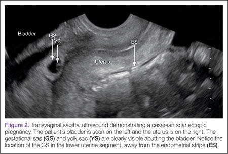 Clinical history can be helpful in differentiating CSEP from alternative diagnoses. Patients undergoing spontaneous abortion are more likely to have lower abdominal cramping and experience greater loss of blood. While there is no correlation between the number of cesarean deliveries a woman has had and the likelihood of developing a CSEP, factors that impede myometrial healing (eg, preterm cesarean, cesarean after arrest of first stage of labor, chorioamnionitis) do, however, increase a patient’s risk of developing CSEP.5