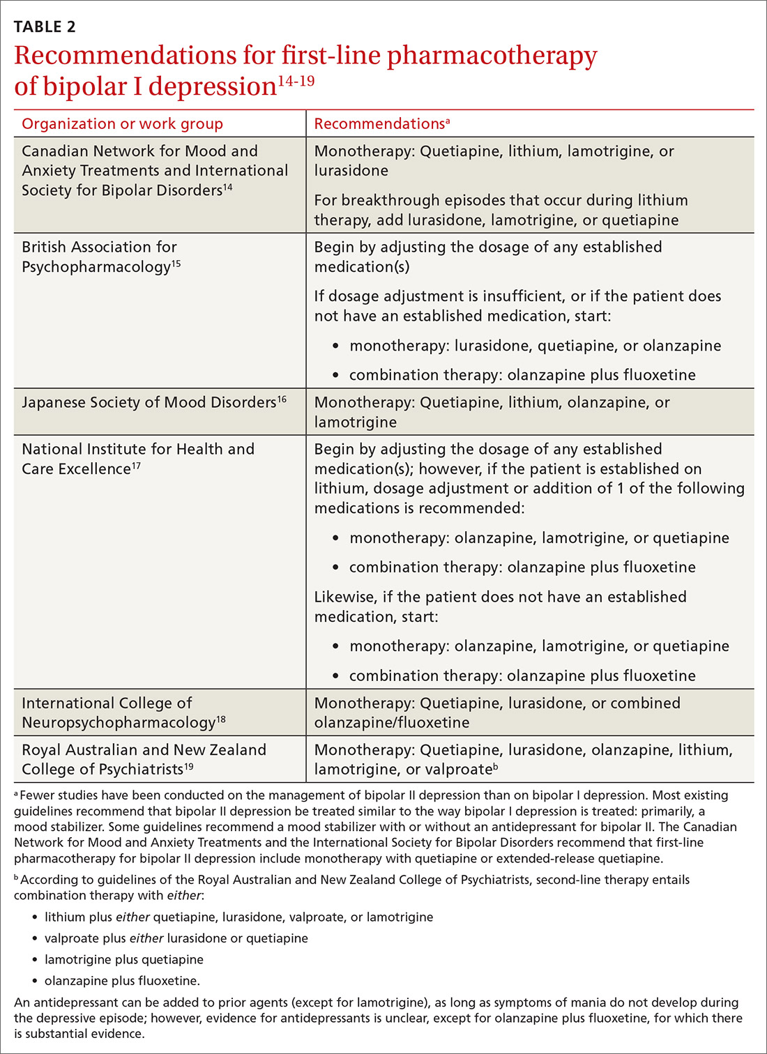 For this article, we searched PubMed and Google Scholar for guidelines for the management of bipolar disorders in adults that were published between July 2013 (when the US Food and Drug Administration [FDA] approved lurasidone for the treatment of BD) and March 2019. Related guideline-referenced articles and clinical trials were also reviewed.