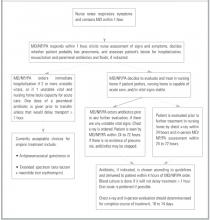 For patients willing to be hospitalized, the panel suggested categorization into 1 of 3 groups: patients whose severity of illness mandates hospitalization; patients whose severity of illness is such that the nursing home’s capacity to deliver acute care should be considered; and patients so stable that treatment in the nursing home is preferable. This set of recommendations is based on 2 retrospective series which suggest that only patients with elevated respiratory rates benefit from hospitalization2 and that patients hospitalized according to criteria similar to these tended to have better survival.11 These recommendations are modeled after Fine’s prediction rule to identify low-risk patients with community-acquired pneumonia,33 and take into account the mortality prediction model of Naughton and coworkers34 for nursing home-acquired pneumonia.