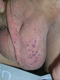 The FP recognized these flat-topped papules as angiokeratomas of the scrotum (also known as Fordyce spots). These are more common in men, but can also occur on the vulva.