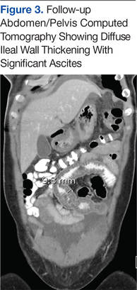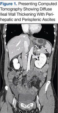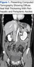 While in the ED, the patient’s physical exam revealed mild tachycardia (104 bpm on arrival, which improved with fluid resuscitation) and diffuse abdominal tenderness. Laboratory evaluation revealed a mild leukocytosis (10.7 x 103/L) but normal liver-associated enzymes, lipase, and urinalysis. A computed tomography (CT) scan of the abdomen and pelvis with oral and IV contrast revealed diffuse ileal wall thickening with significant perihepatic and perisplenic ascites with pelvic free fluid suspicious for an inflammatory vs infectious enteritis (Figure 1).