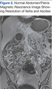 Similar to her prior visit, a mild leukocytosis (10.3 x 103/L) was the only laboratory abnormality. Imaging was not repeated. She was again treated supportively, and once more, her symptoms resolved spontaneously. An upper endoscopy with push endoscopy was performed and no abnormalities were identified as far as the proximal jejunum (about 130 cm from the incisors). The mucosa of the colon and distal terminal ileum were shown to be normal on colonoscopy. Random biopsies were taken throughout the gastrointestinal tract and all showed no histologic abnormalities. A magnetic resonance enterography was performed shortly thereafter and revealed resolution of the prior bowel wall thickening (Figure 2).Six weeks after her initial presentation, the patient presented to the ED for the third time with the same symptoms. A CT scan again displayed diffuse ileal wall thickening with significant ascites; slightly worse than the image from initial presentation (Figure 3).