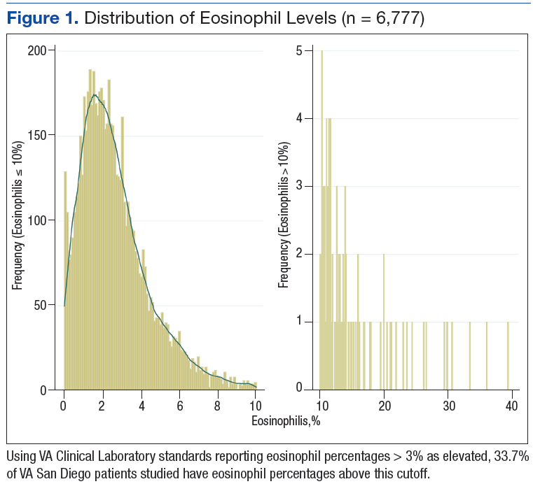 Based on the VA Clinical Laboratory standards, a peripheral eosinophil percentage > 3% was considered elevated. Absolute eosinophil levels also were calculated to determine whether elevated eosinophil levels were associated with absolute counts reflective of eosinophilia. Counts of 500 to 1,499 eosinophils/mL were considered mild eosinophilia, 1,500 to 4,999 eosinophils/mL considered moderate eosinophilia, and ≥ 5,000 considered severe eosinophilia.9