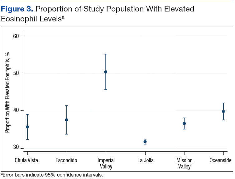 Grouping the records by clinic, 30% to 40% of patients had elevated eosinophil levels at all sites except for Imperial Valley (Figure 2). At the Imperial Valley site, 50.5% of patients had elevated eosinophil levels, which was statistically higher than those of all other sites (Figure 3).