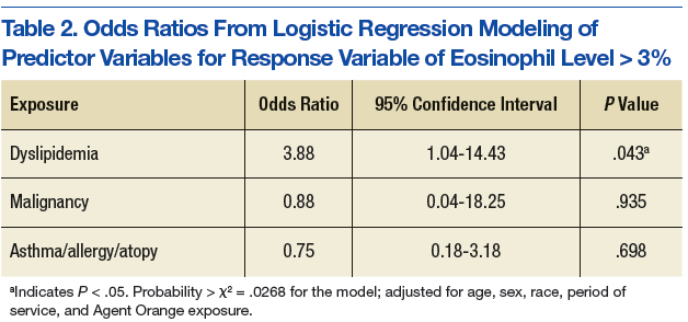 Of the key predictor variables of interest, only dyslipidemia was found to predict elevated eosinophil levels. Patients with a diagnosis of dyslipidemia were found to have nearly 4 times greater likelihood of having elevated eosinophil levels compared with patients without dyslipidemia (odds ratio 3.88, 95% confidence interval: 1.04-14.43). Patients with malignancy or a history of asthma, allergy, or atopy were not found to have significantly different odds of having elevated eosinophil levels compared with baseline within the study population.