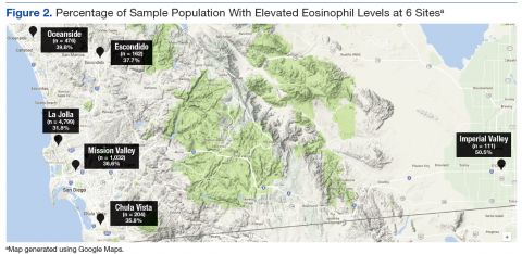 The authors tested the null hypothesis that there is no association between geographic location and the proportion of the population with elevated eosinophil levels. A Pearson χ2 test of the proportion of elevated eosinophil level (P < .001) indicated that the observed differences in elevated eosinophil levels were unlikely due to chance. Further sets of exploratory χ2 tests comparing only 2 sites at a time identified Imperial Valley as differing significantly from all other sites at α = .05. Eosinophil proportions at the Mission Valley (P = .003) and Oceanside (P < .001) sites also were found to differ significantly from the La Jolla site. In contrast, eosinophil proportions at the Escondido (P = .199) and Chula Vista (P = .237) sites did not differ significantly from those of the La Jolla site using χ2 testing.