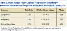 Logistic regressions assessed whether elevated eosinophil levels > 3% might be explained by predictor variables, such as a history of dyslipidemia, malignancy, or asthma/allergies/atopy (Table 2). As no parasitic infections or HIV diagnoses were identified in the patient population, they were noncontributory in the model. The probability of obtaining the χ2 statistic given the assumption that the null hypothesis is true equals .027 for the model, suggesting that the overall model was statistically significant at the α = .05 level.
