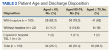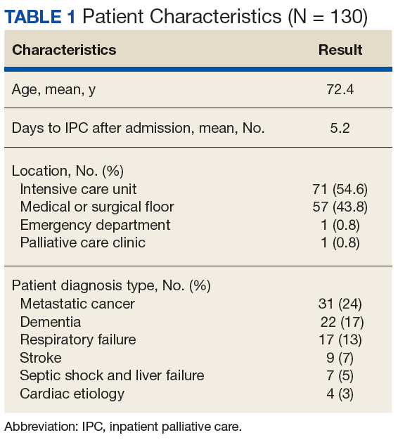 This study was exempt from internal review board approval. The attending physician kept track of each IPC encounter between September 2014 and April 2016. Data were retrieved from the Computerized Patient Record System by identifying charts that included family meeting notes during the specified time. All 130 patients included in this study were followed by the PC team. Patient charts were reviewed, and information was uploaded to spreadsheets, which became the database for this study. The data included age, patient location, diagnosis, number of days between admission and PC consultation, and number of days between admission and family meeting. Other data included code status changes and discharge dispositions. Only consultations that resulted in direct patient contact were included.