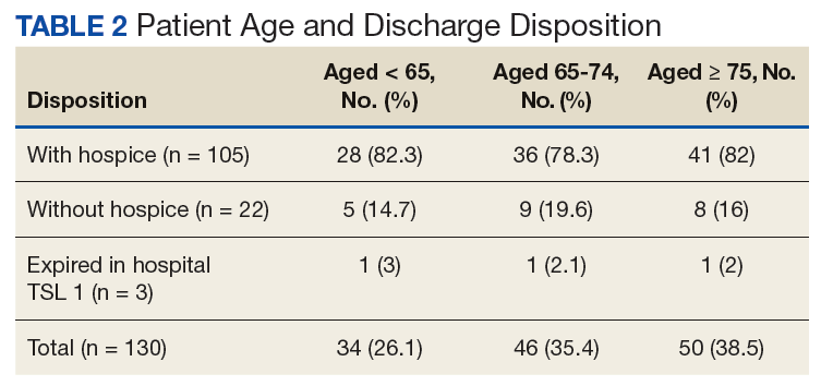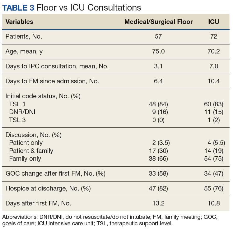 During the study, only 3 of 130 (2%) patients died who were TSL I in the hospital; the majority were discharged to hospice care (80%).The mean days for an initial IPC consultation following admission was 3 on the medical/surgical floors and 7 days for ICU (P = .003; 95% CI, -6.37 to 1.36).