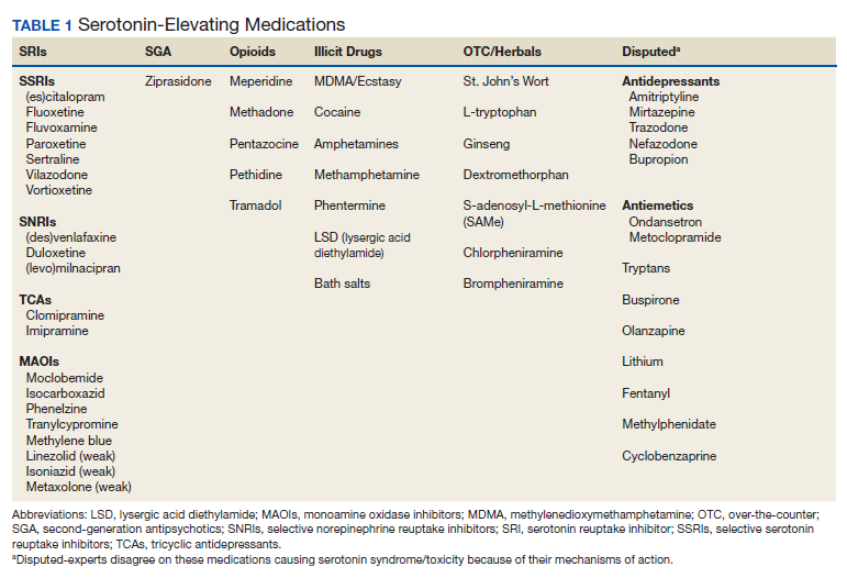 The incidence of ST has increased over the past decade.5,6,10,11 Several reasons explain this increase: (1) ST mirrors the increase in depression in the US populations10,12,13; (2) There has been an increase in off-label antidepressant prescribing by both primary care and mental health providers14-16; (3) the increased use of illicit drugs13; (4) an increase in suicide attempts with antidepressants17; and (5) increased use of opioids for pain management, including both prescription and illicit use.11,14 This paper reviews the potential lethal combinations of commonly prescribed medications used to treat both veteran and nonveteran patients and includes the latest information on offending medications; a presentation of symptoms from in utero to adult; diagnostic criteria; and recommended treatments.