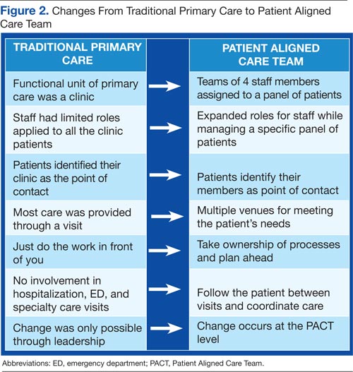 In 2010, the VHA implemented the patient-centered medical home model of primary care health care as part of its transformational T-21 Initiatives.1 Now known as Patient Aligned Care Teams (PACTs), the key pillars of the model include the expanded roles and responsibilities of multidisciplinary care teams who provide enhanced access and coordinated care. This model is based on a foundation of adequate resources, patient centeredness, and process improvement (Figure 1).