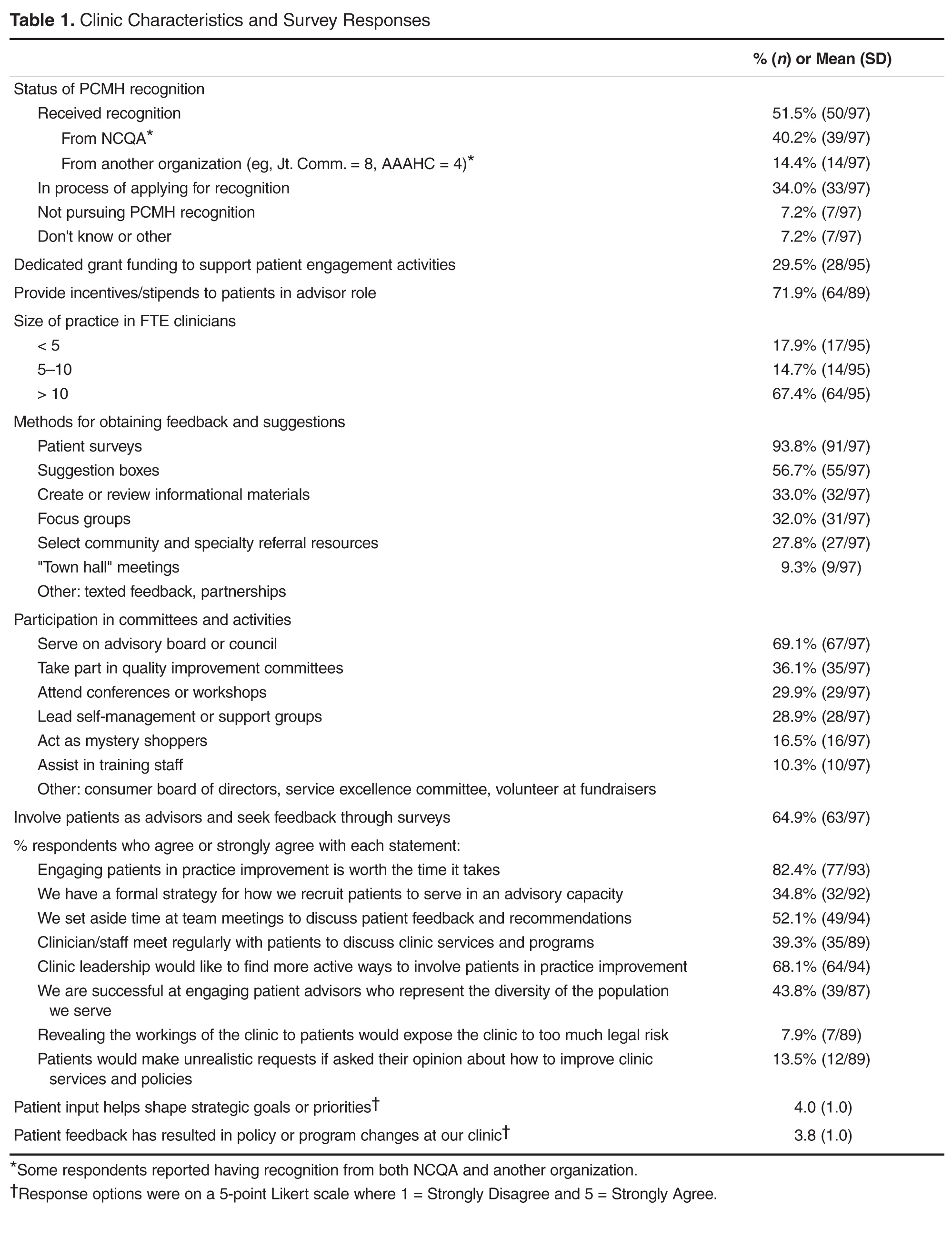 Of the 470 CHCs who were invited to participate in the survey, 97 took part, for a response rate of 21%. On individual items the percentage of missing data ranged from 0 to 8%. The majority of respondents (67%; 64/95) reported having 10 or more FTE primary care providers ( Table 1 ). Half of respondents reported that their CHC had received PCMH recognition (52%; 50/97), mostlythrough the NCQA, and one-third reported that they had dedicated funding for patient engagement activities (30%; 28/95). Respondents primarily belonged to clinical (43%) or operational (40%) areas of leadership in their practices.The most common mechanisms for receiving patient feedback were surveys (94% of respondents; 91/97) and suggestion boxes (57%; 55/97; Table 1). A third of respondents reported soliciting patient feedback on information materials (33%; 32/97), and almost a third involved patients in selecting referral resources (28%; 27/97). As for ongoing participation, 69% (67/97) of respondents reported involving patients on advisory boards or councils, and 36% (35/97) invited patients to take part in quality improvement committees. Other common activities included inviting patients to conferences or workshops (30%; 29/97) and asking patients to lead self-management or support groups (29%; 28/97).