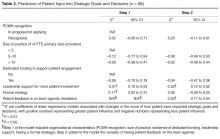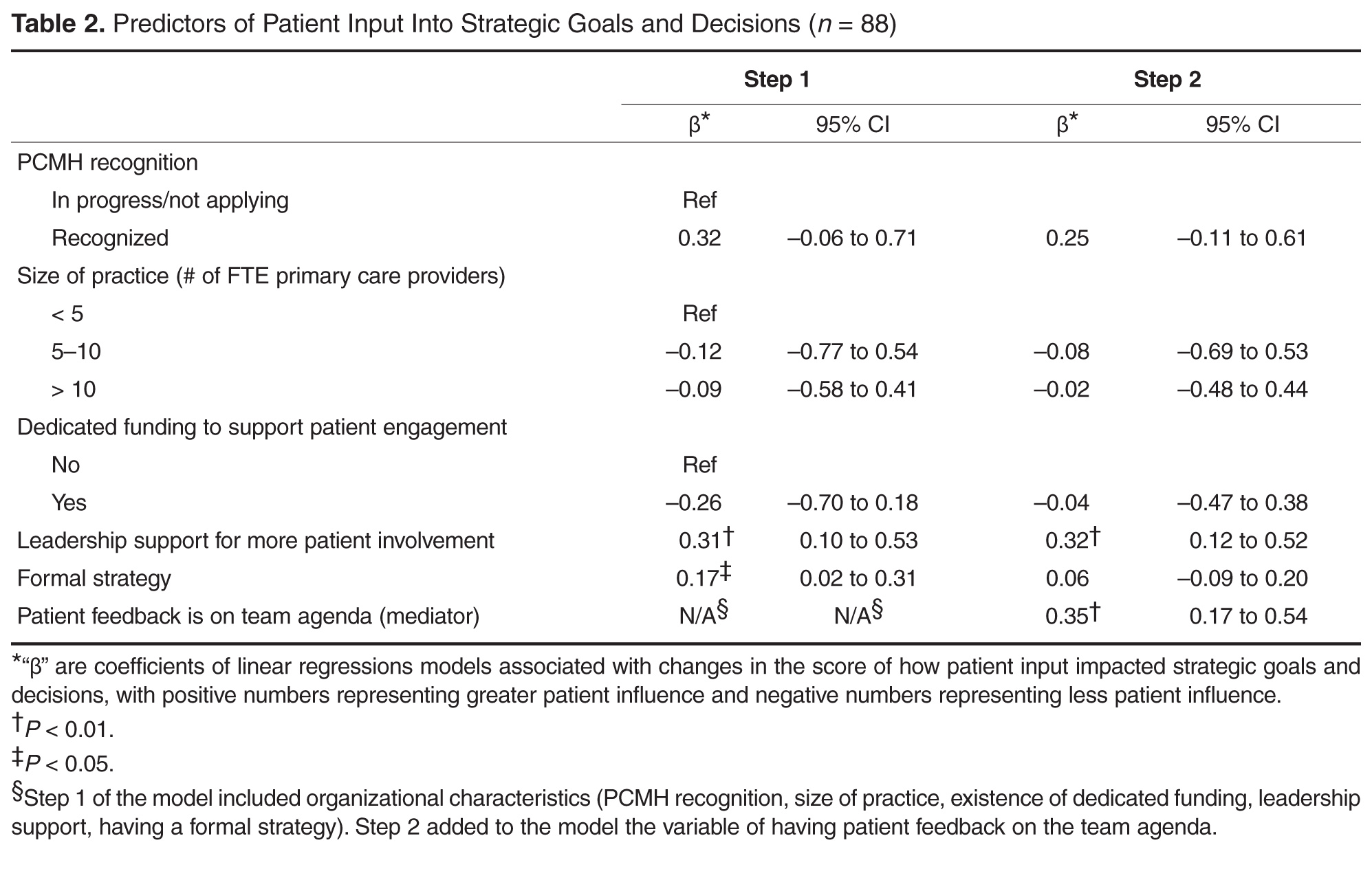 In Step 1 of the multivariate models, clinic leadership support and having a formal strategy for recruiting and engaging patients was associated with greater patient engagement in shaping strategic goals and priorities ( Table 2