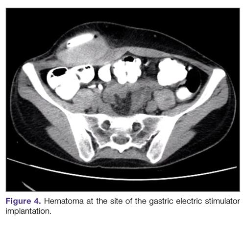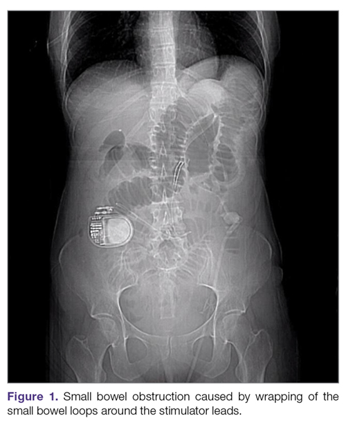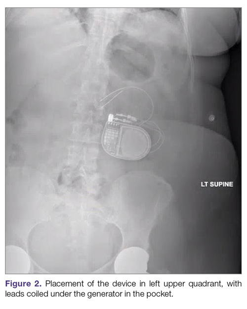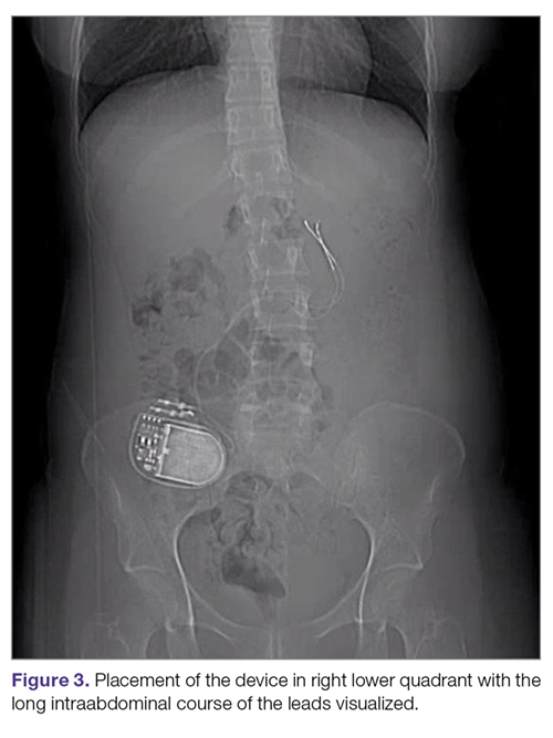 Intestinal obstruction. Although rare, the intestines can get wrapped around the leads of the device, causing different degrees of obstruction (Figure 1). Positioning the device in the left upper quadrant minimizes the intraabdominal length of the leads and pulls them maximally out, coiling under the device (Figure 2). In cases where other locations are used either due to a hostile upper abdominal region (skin infection, presence of gastrostomy or other devices) or surgeon’s preference, the GES device can be implanted in the lower abdomen (Figure 3). In these circumstances, carefully draping the omentum over the bowels might help to prevent this complication. Tacking of the leads to the parietal peritoneum with sutures can also be preventative. In cases of obstruction requiring intervention by laparotomy or minimal access techniques (laparoscopy or robotic assisted surgery), all efforts are made to preserve the neurostimulator leads. In cases that require bowel resection, lead contamination is a serious concern, but lead explantation is not mandatory. Close postoperative monitoring for the development of lead infection is required.