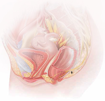 | The lower vagina and vulva are richly supplied with peripheral nerves and are, therefore, sensitive to pain, particularly the region of the hymeneal ring. Although the pudendal nerve (arrow) courses through the area, it is an uncommon source of vulvar pain. |