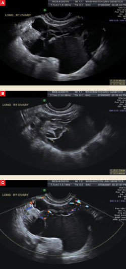 This complex mass of the right ovary, seen from different vantage points in A and B, contains multiple cysts and septations. Minimal blood flow is apparent in C.