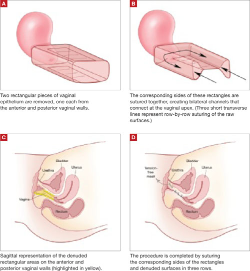 When removing the vaginal epithelium, it may be helpful to use the skills developed for anterior and posterior colporraphy. Our operation begins with a 5- to 6-cm transverse incision at the anterior vaginal apex, which creates the proximal side of the anterior rectangle described above (FIGURE 2A).