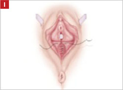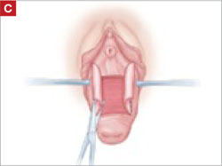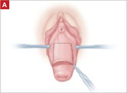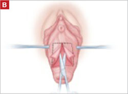 As you develop the plane between the epithelium and fibromuscular layer, make a midline sagittal incision and extend it to the urethrovesical junction (FIGURE 2B). Dissect the epithelium off the fibromuscular layer approximately 3 cm bilaterally, then make a transverse incision at the urethrovesical junction. Finally, remove the anterior rectangle in two pieces by cutting along the lateral sides (FIGURE 2C AND D). Remove the posterior rectangle using the same technique, but also excise a triangular piece of skin from the posterior fourchette for the perineorraphy portion of the procedure (FIGURE 2E).